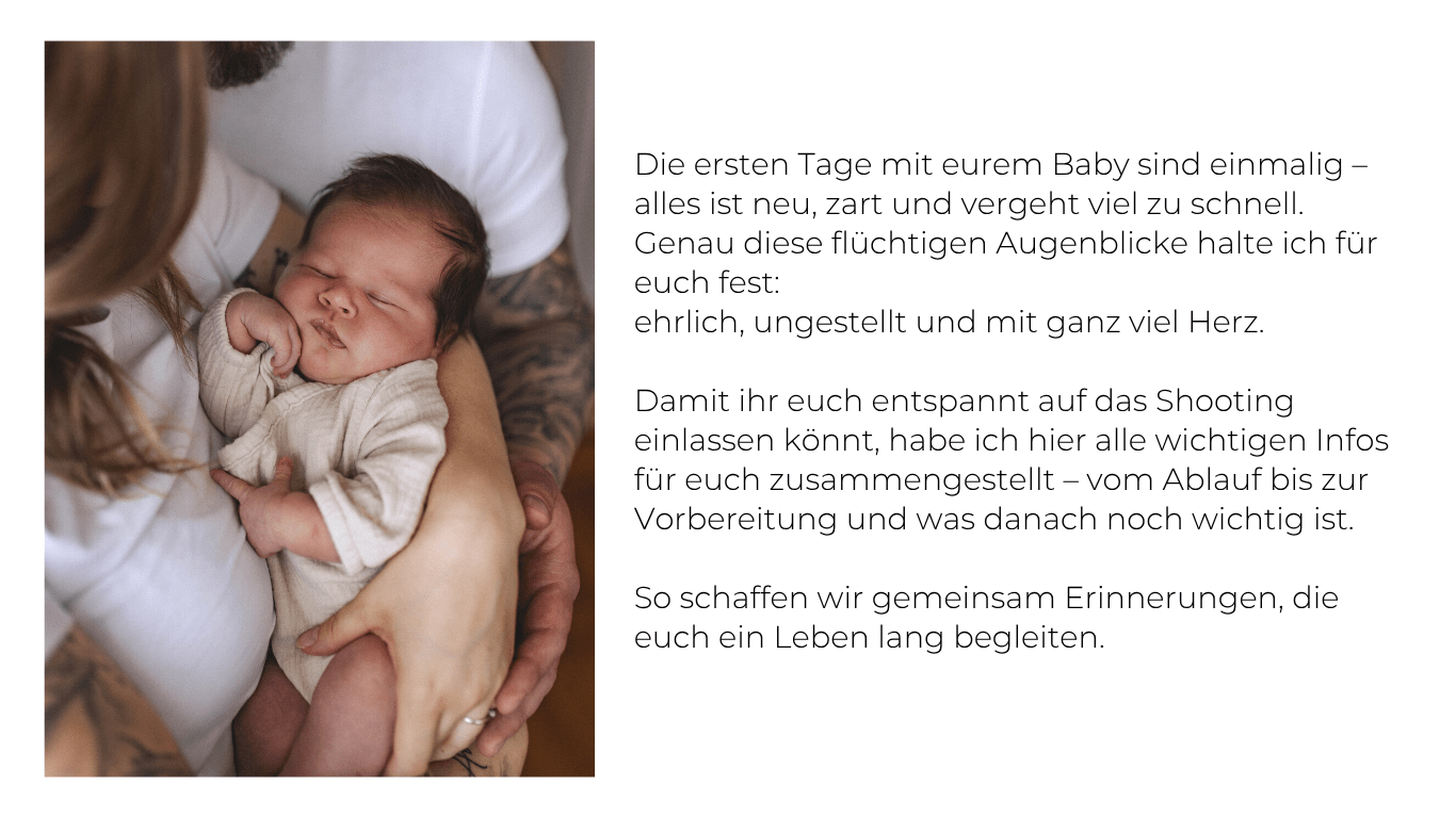 Eure Hände sind oft im Bild. Achtet daher auf gepflegte Nägel und verzichtet auf auffälligen Nagellack oder Schmuck. Zusätzliche Kleidung für euer Baby ist im Studio vorhanden.